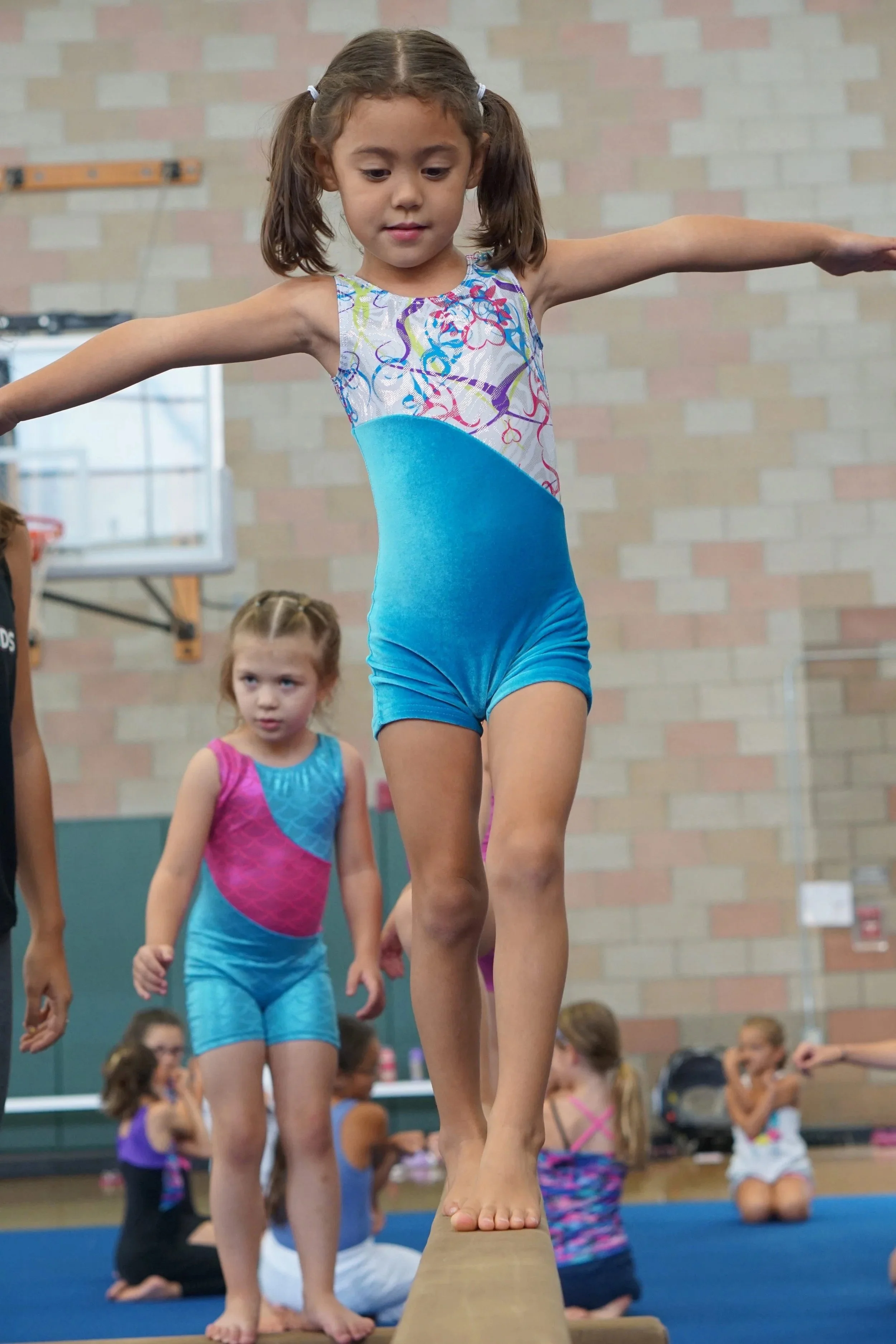 Our Tiny Tots class focuses on building body awareness while learning basic fundamental skills of artistic gymnastics. This class builds coordination, body awareness, balance and flexibility, while encouraging social and motor skills. This class incorporates movement, play, music and fun! Students are introduced to the four apprentices of artistic gymnastics (Floor, Beam, Bar, and Vault) and learn fundamental gymnastics positions and skills.